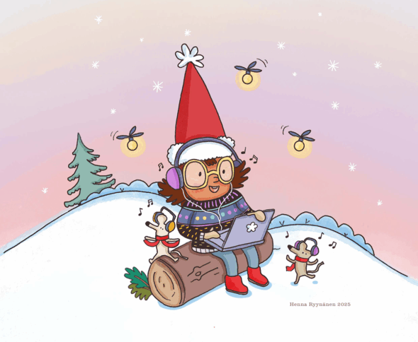 Vuoden 2025 kalenterissa seikkailee tonttuja. Tässä digitonttu Beta.